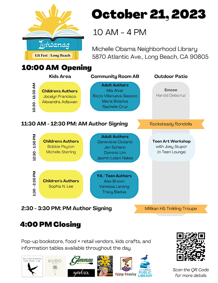 Join us at Liwanag Lit Fest 2023, a free literary festival shining a light on the vibrant diversity of Filipinx storytelling, organized by the Long Beach Public Library, Bel Canto Books, and our amazing volunteer team of book lovers!