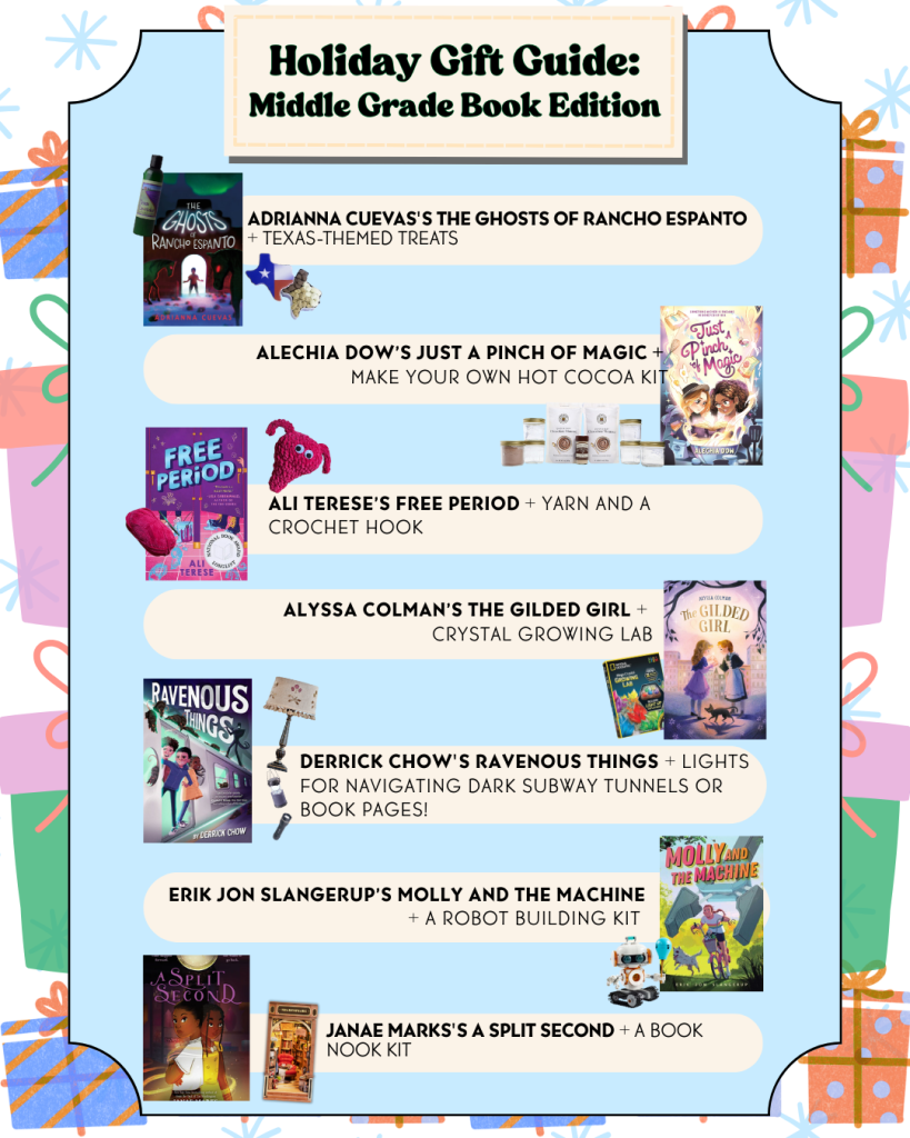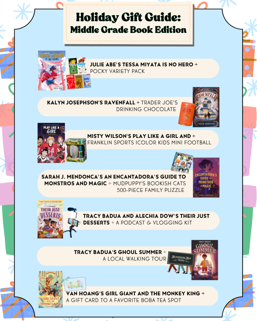 We’re gearing up for gift-giving season, and I bugged a few of my gracious middle grade author friends for ideas on what to pair with their books for some fun bundles. Kids love unboxing presents that have an element of YayNow (cool toy/food/drink!) and YayLater (book to cozy up with!), and these bundles are it!